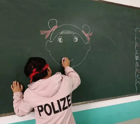 游戲開(kāi)始了,老師先畫(huà)了一個(gè)大頭娃娃,然后說(shuō):“誰(shuí)來(lái)畫(huà)這個(gè)鼻子?”