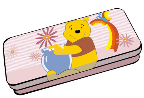 文具盒的封面畫著一只可愛的小白兔,一只拿著鮮花正在歡呼的烏龜和一只拿著藍旗的狐貍,看樣子它們正在開運動會。